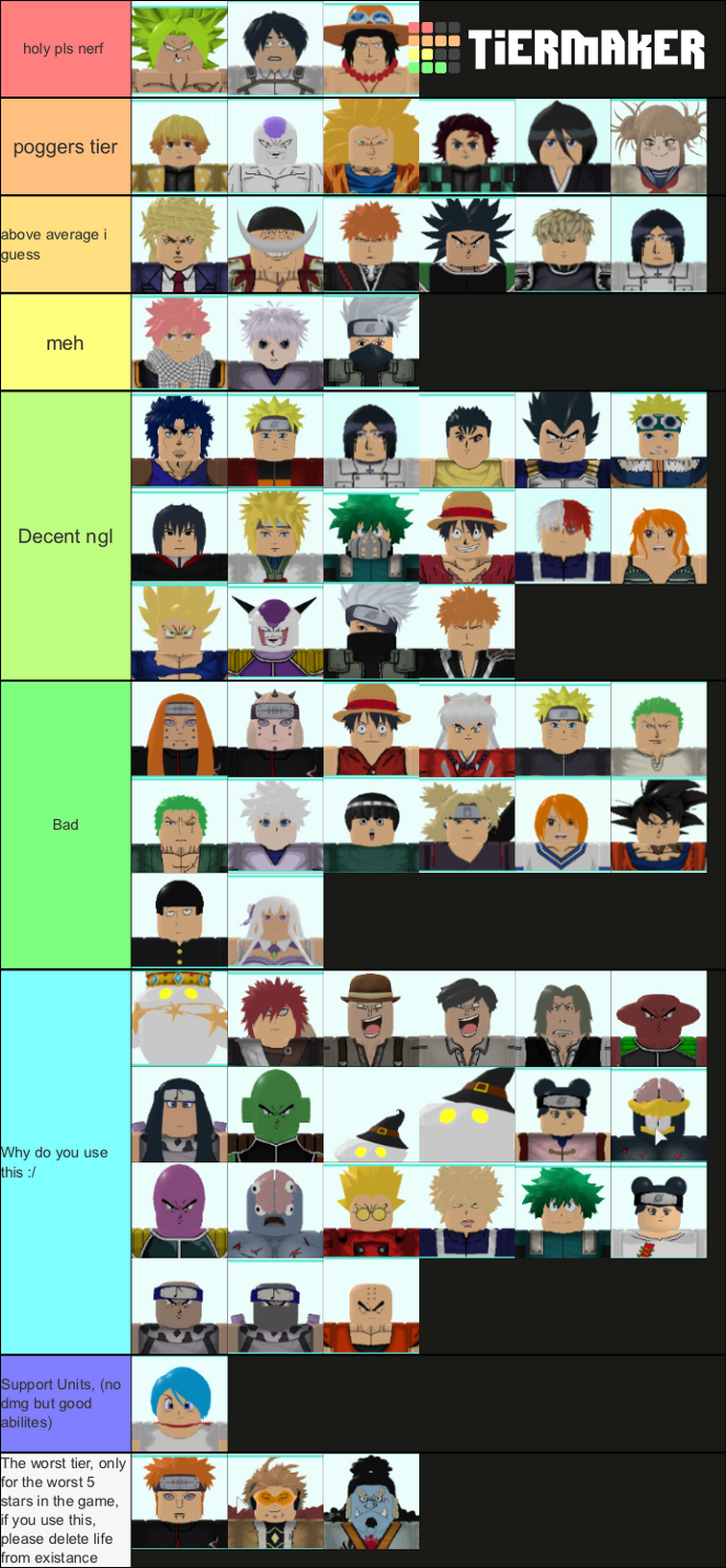 All Star Tower Defense Tier List Community Rank Tiermaker from tiermaker.com The character list contains all characters based on their star rating. The game offers a large variety of character going from single target to aoe (area of effect), from one piece to demon slayer characters. All star tower defense is, as the name suggests, a tower defense type game but instead of your regular turret and guns, they are anime based characters. You can see what characters are the best to roll for in our all star tower defense tier list. That way you can identify characters based on that. Just because a tower is a specific rarity doesn't mean its good, because some are only used for upgrades or evolutions, examples are namu iv, exp iii, and demon v. Mar 26, 2021 · 1 character summon = 150 gold (150 gold per character) 10 characters summon = 1,100 gold (110 gold per character) the selection of characters you can roll in both gem summon and gold summon reset every hour.